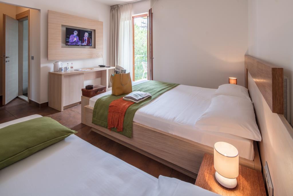 Le camere sono dotate di servizi privati con doccia, aria condizionata, Tv-Sat, telefono, cassaforte, Wi.Fi e ampia terrazza. CAMERA SINGOLA Una camera singola non deve essere necessariamente piccola: un ampio letto alla francese è quello che fa per voi se volete godervi qualche giorno di comfort e relax! Bagno recentemente rinnovato, camera con balcone attrezzato vista pineta. A disposizione aria condizionata/pompa di calore, frigo, tv a schermo piatto con canali multilingue e wifi gratuito. In tutte le camere troverete anche un attacco USB per ricaricare il vostro device. Se viaggiate con il vostro amico a 4 zampe, chiedeteci pure la cuccia per lui, saremo felici di far trascorrere anche a lui delle comodi notti vicino a voi! CAMERA DOPPIA MATRIMONIALE A disposizione avrete una ampia camera con tutti i comfort: bagno rinnovato, aria condizionata/pompa di calore, balcone attrezzato vista giardino/pineta, frigo, tv a schermo piatto multilingua e wifi gratuito. In tutte le camere troverete anche un attacco USB per ricaricare il vostro device. Se in vacanza c'è anche il vostro bimbo, c'è la possibilità di inserire un lettino da campeggio (in base a disponibilità) ed eventualmente se con voi viaggia anche un amico a 4 zampe chiedeteci pure una cuccia per lui! CAMERA TRIPLA A disposizione avrete una ampia camera con letto matrimoniale e un comodo letto singolo, attrezzata di tutti i comfort: bagno rinnovato, aria condizionata/pompa di calore, balcone attrezzato vista giardino/pineta, frigo, tv a schermo piatto multilingua e wifi gratuito. In tutte le camere troverete anche un attacco USB per ricaricare il vostro device. Se in vacanza c'è anche un altro bimbo, c'è la possibilità di inserire un lettino da campeggio (in base a disponibilità) ed eventualmente se con voi viaggia anche un amico a 4 zampe chiedeteci pure una cuccia per lui! CAMERA COMUNICANTE PER 4 PERSONE Una famiglia numerosa, due coppie di amici, una grande compagnia...le nostre camere comunicanti sono l'ideale per chi vuole godere della privacy di due stanze separate, ma con il comfort di una stanza più grande grazie alla porta intercomunicante. A vostra disposizione avrete due bagni, due balconi, due arie condizionate/pompe di calore, 2 frighi, 2 tv a schermo piatti multilungue e wifi gratuito. In tutte le camere troverete anche un attacco USB per ricaricare il vostro device. Se in vacanza c'è anche il vostro bimbo, c'è la possibilità di inserire un lettino da campeggio (in base a disponibilità) ed eventualmente se con voi viaggia anche un amico a 4 zampe chiedeteci pure una cuccia per lui! CAMERA COMUNICANTE PER 5 PERSONE Una famiglia numerosa, due coppie di amici, una grande compagnia...le nostre camere comunicanti sono l'ideale per chi vuole godere della privacy di due stanze separate, ma con il comfort di una stanza più grande grazie alla porta intercomunicante. A vostra disposizione avrete due bagni, due balconi, due arie condizionate/pompe di calore, 2 frighi, 2 tv a schermo piatti multilungue e wifi gratuito. In tutte le camere troverete anche un attacco USB per ricaricare il vostro device. Se in vacanza c'è anche il vostro bimbo, c'è la possibilità di inserire un lettino da campeggio (in base a disponibilità) ed eventualmente se con voi viaggia anche un amico a 4 zampe chiedeteci pure una cuccia per lui!